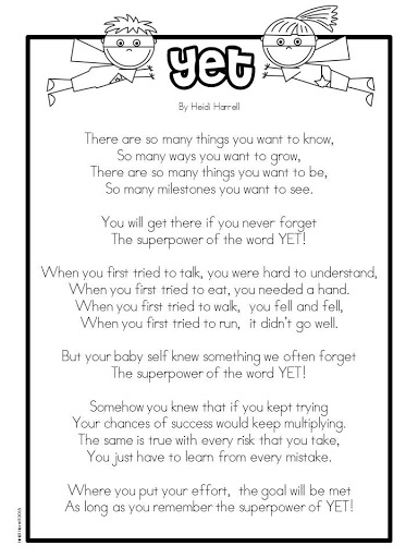 In a previous post I wrote about my boys and how we are trying to identify a fixed mindset when we see it and work towards building a growth mindset. As part of that process, we have begun to explore the “Power of Yet.” A three letter word….but it can be so powerful.