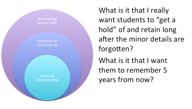Enduring Understandings: For example, in some cases, some teachers would put a long list of enduring understandings (EU) for a unit. Upon further review and in sticking with the expectations of 2-3 enduring understandings per unit, we found that if they had a lot of EUs listed, it often meant that they were putting content in that section. Another lesson learned for Enduring Understandings was that sometimes the first inclination in some content areas (such as math and science), was a tendency of many teachers to make them too specific, rather than broad, big ideas that have enduring value beyond the unit and classroom.