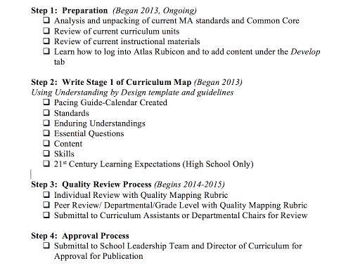 So it has been awhile since my last blog post on our curriculum mapping journey, but that is because much of our work in this process has occurred at the conclusion of this past school year. As groups have worked on curriculum updates, they have started to integrate the quality curriculum map rubrics into their review and revision of their maps. We are finally at the point where we have curriculum maps that are ready to publish on our public site as of this July 2015.